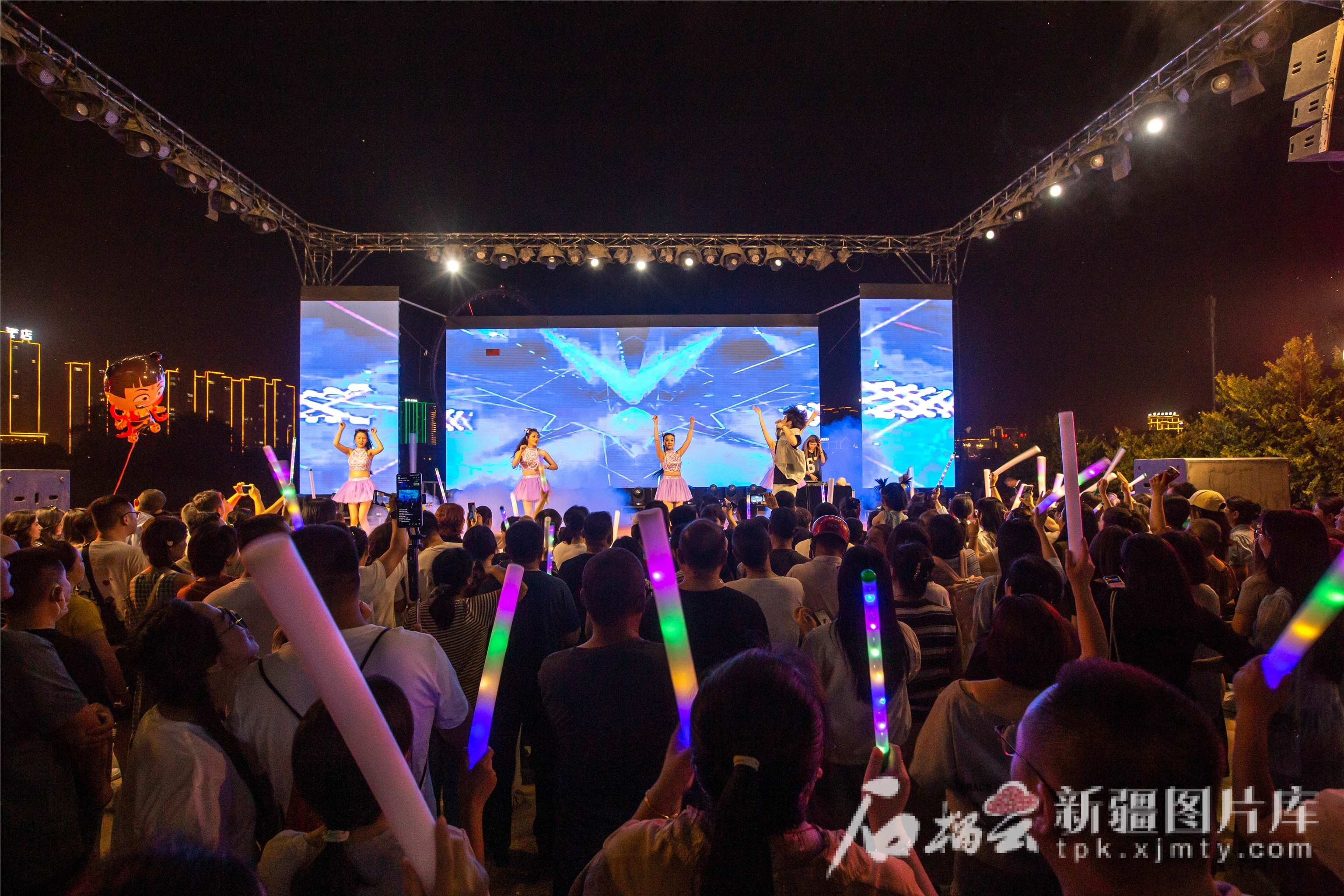 5月31日,游客在库车市城南街道南湖夜市音乐节观看演出。袁欢欢摄
