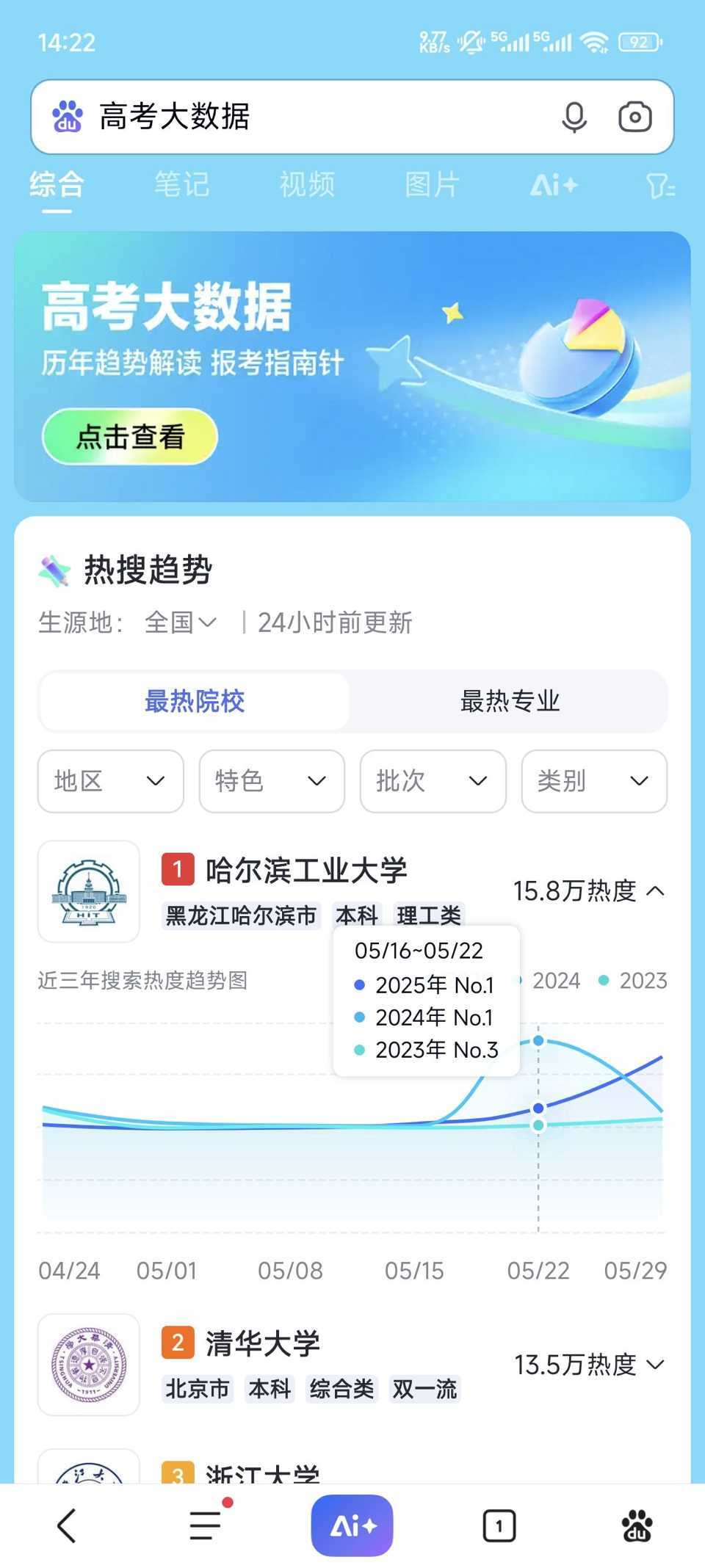 基于日均数十亿次搜索数据,百度推出权威独家的高考大数据。在百度app搜索「高考大数据」或高校名称、专业等关键词,不仅可以深入了解各大院校、专业的概况,还能了解薪资水平、男女比例、毕业去向等信息,让考生及家长全方位掌握信息,做出最符合自身发展规划的选择。