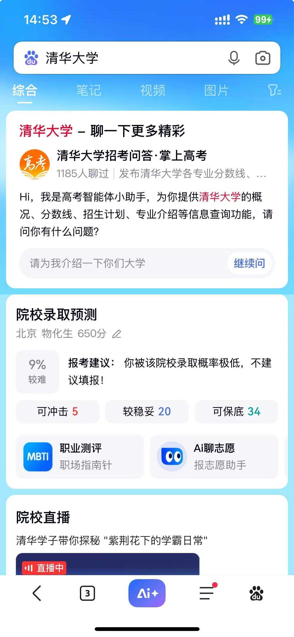 此外,百度搜索还联合中国教育在线·掌上高考上线了2000多所院校的专属智能体,只需在百度app上搜索院校名称,点击「ai院校回答」,不论是招生政策、分数线、专业介绍,还是诸如最好吃的食堂、哪个专业脱单率最高等个性化问题,都能随问随答。
