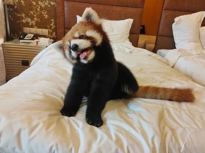有家长晒出孩子在酒店床上与小熊猫亲密互动合影的照片,并配文“小熊猫叫早”。