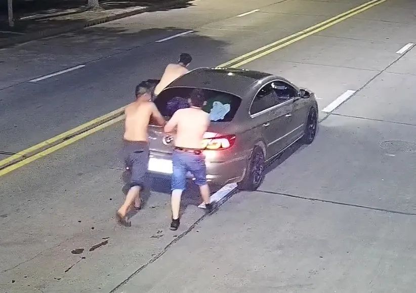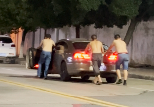 交警支队高新大队民警调看沿途监控发现,三位男子推行一辆小型汽车,从邓城大道辅路右转至樊魏路,经桃园路路口后,在樊魏路一汽修店附近停下。全程接近500米。