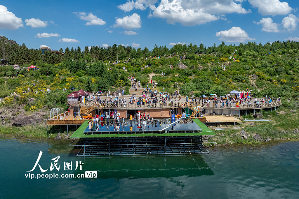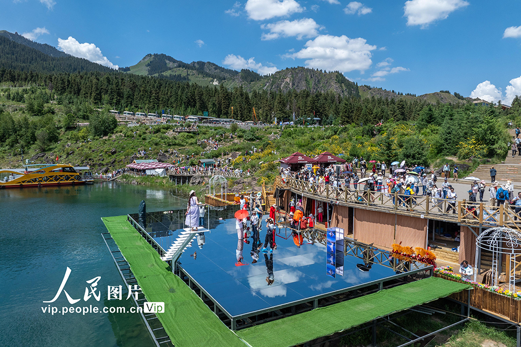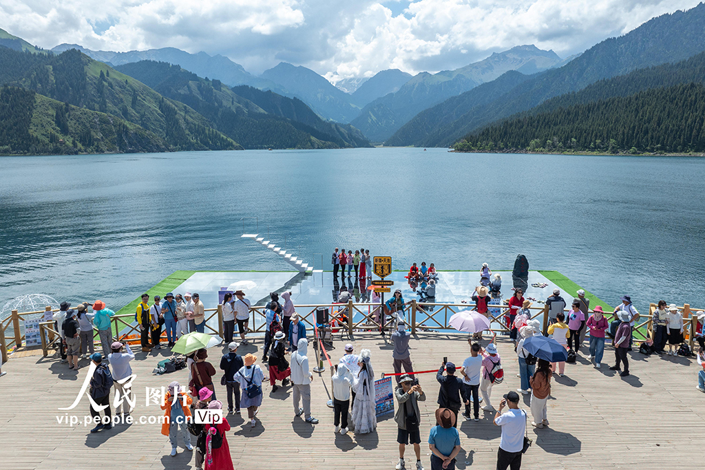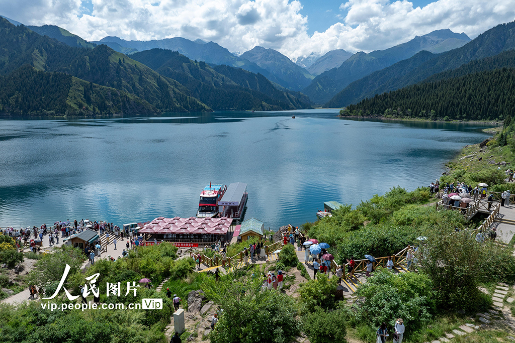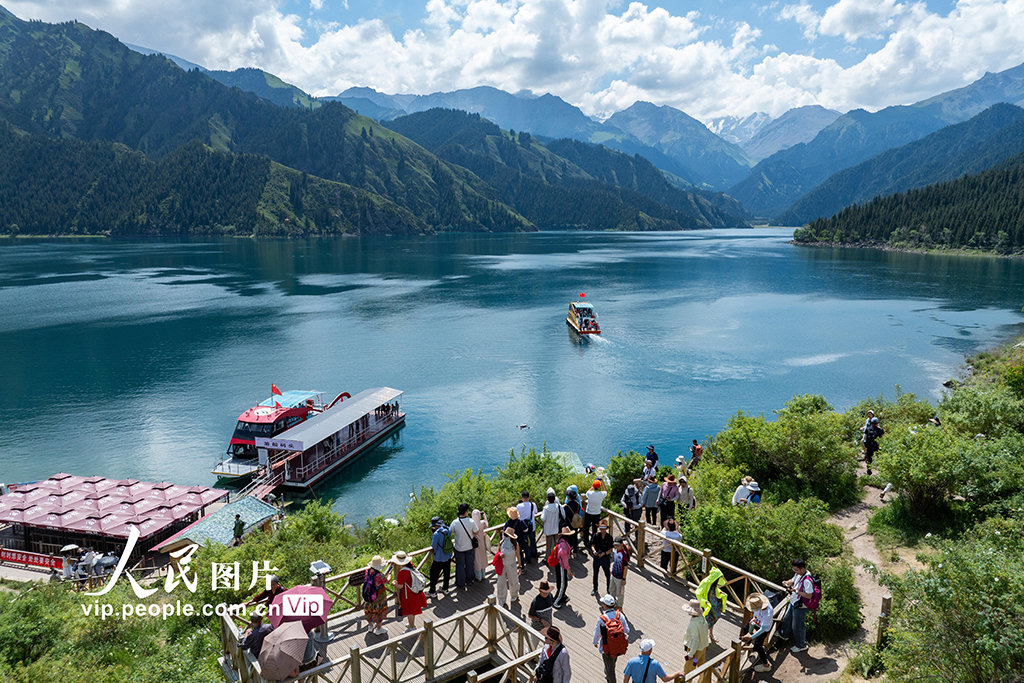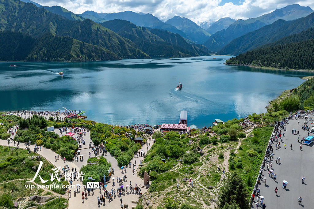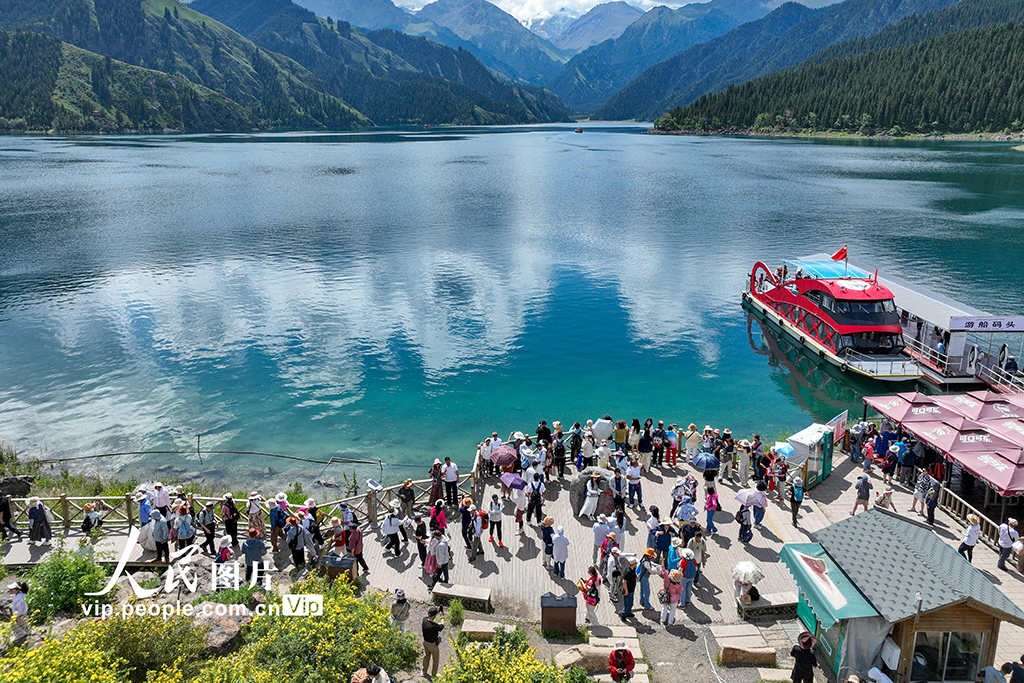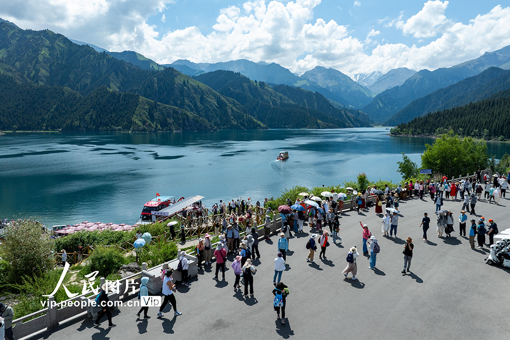 2025年6月18日,新疆昌吉州阜康市天山天池风景区景色秀美,众多游客在此观赏风景、拍照留念。黄胜林摄(人民图片网)