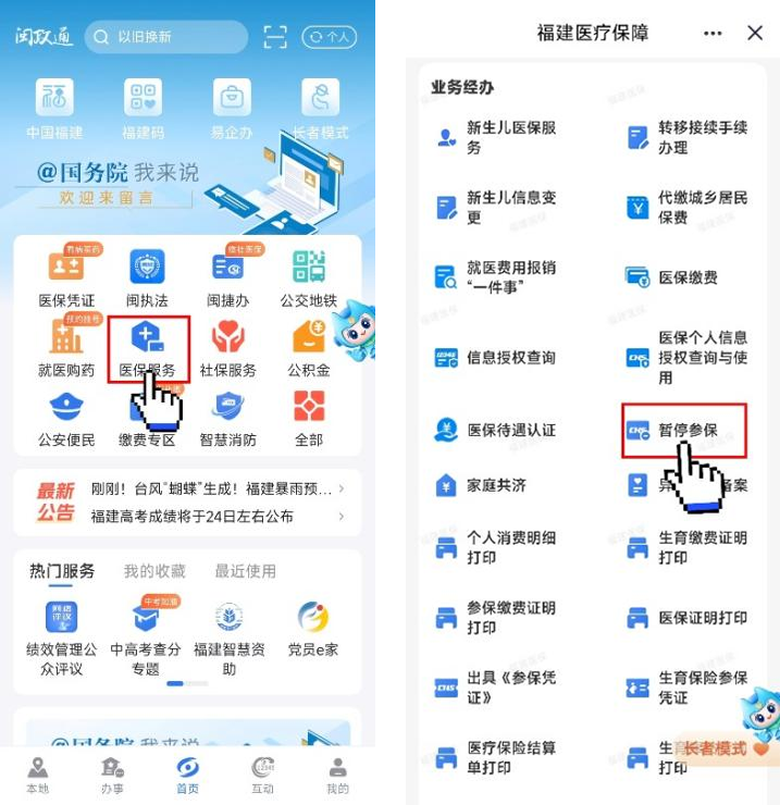 由居民医保(即大学生医保)转为职工医保,一般需要先办理“暂停参保”。如何办理暂停参保,以“闽政通”app为例:
