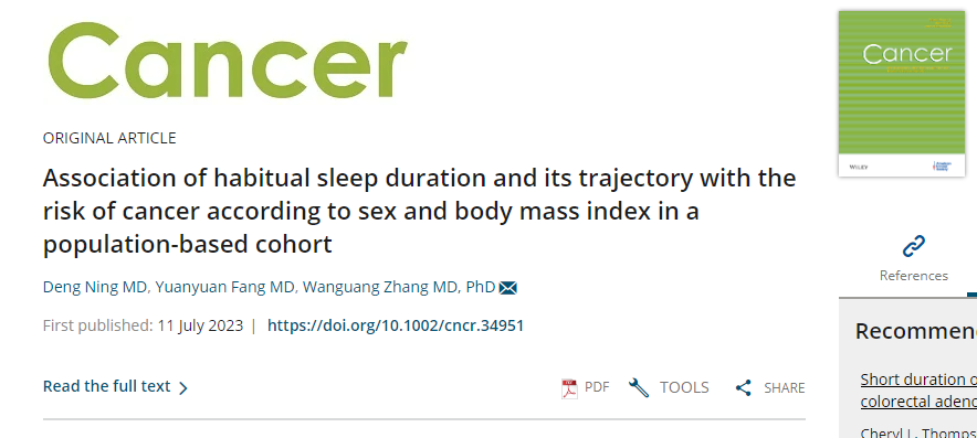 2023年,期刊《癌症》上发布了一项关于国人的睡眠习惯的研究发现,睡眠时间过短与癌症风险升高密切相关。