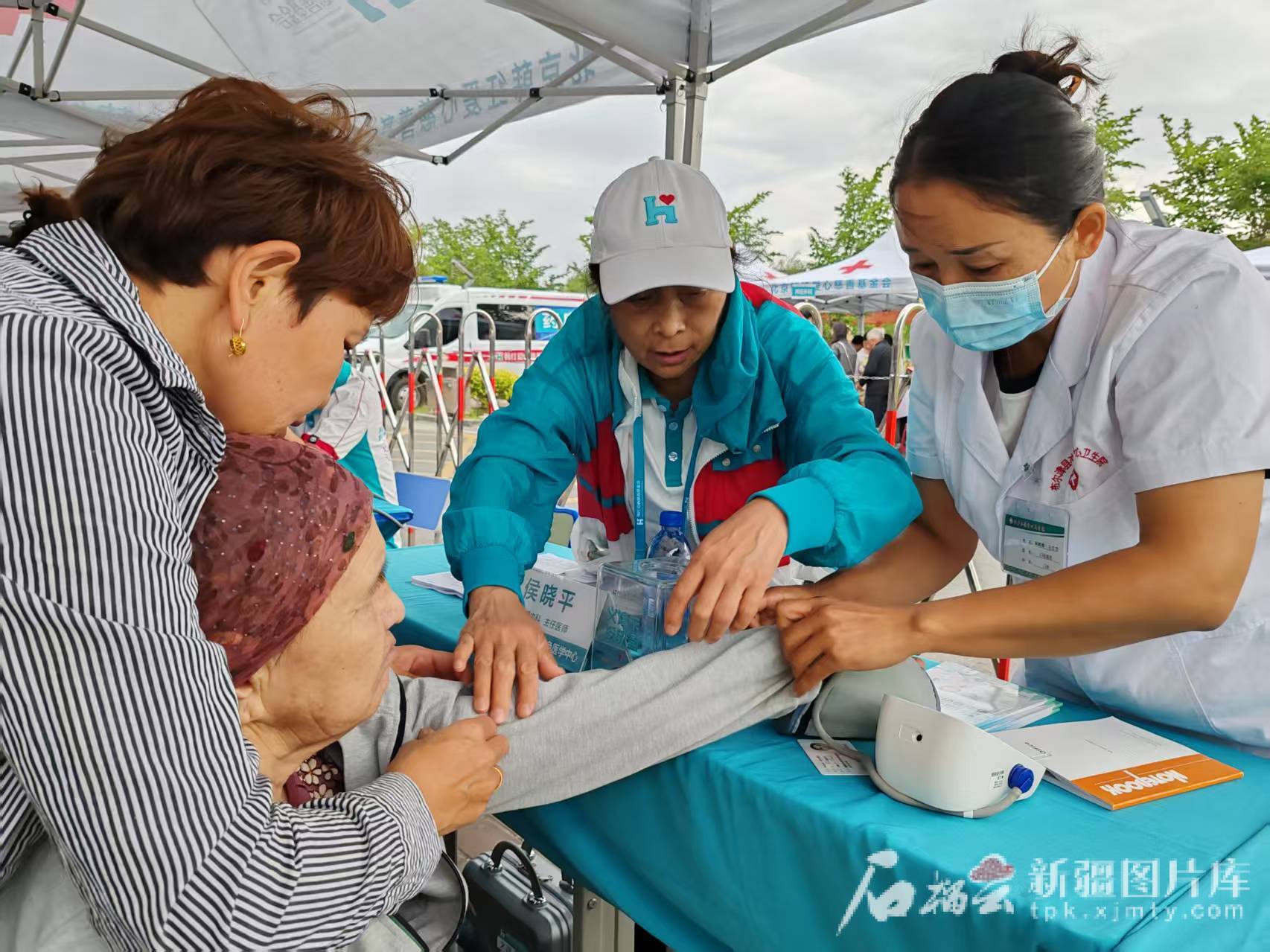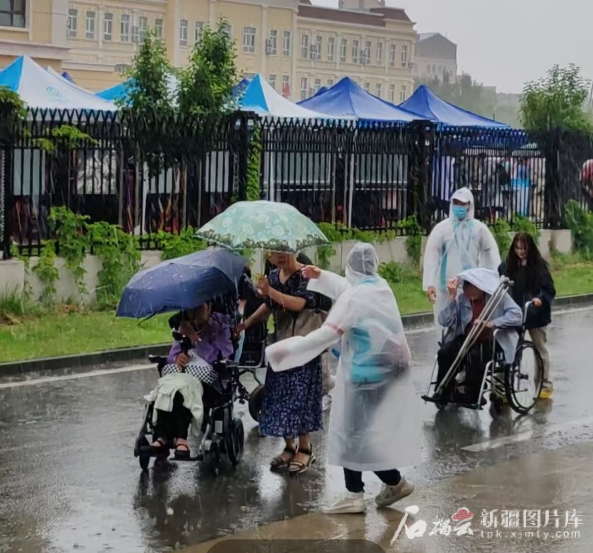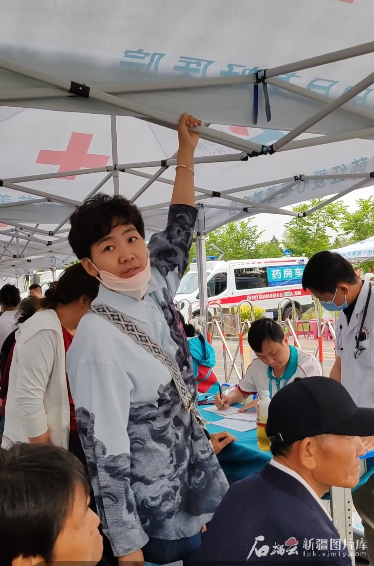 时值夏至,布尔津县的天气却说变就变,面对突如其来的风雨和急剧下降的气温,在布尔津县人民医院的义诊区内,各科室的医疗专家们,依然有条不紊地开展着义诊,外围志愿者们奔跑在风雨中,疏导和引领就诊患者进入等候区避雨,为患者提供贴心的服务。
