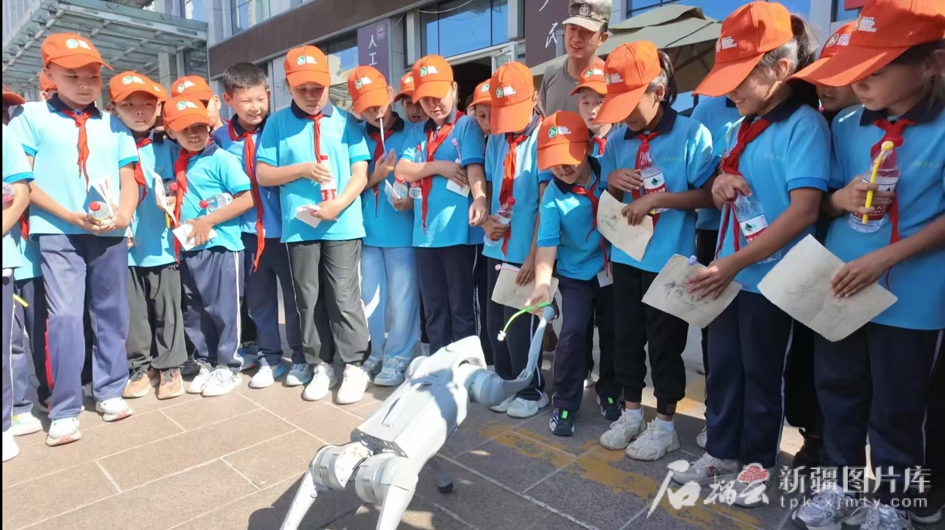 6月22日,在新疆人民出版社(新疆少数民族出版基地),来自呼图壁县的小学生和机器狗互动。李圣华摄