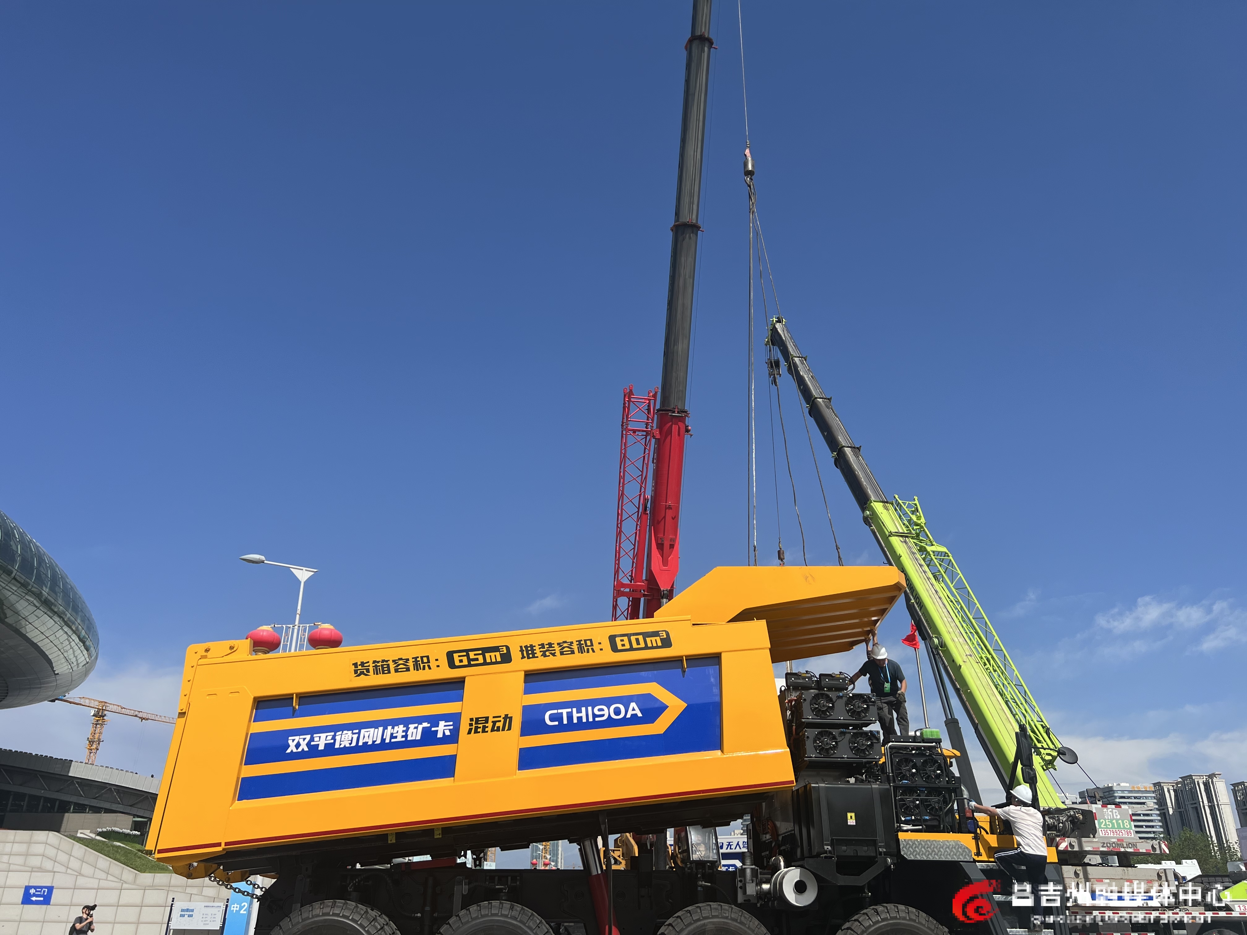 6月24日,商博会室外展区,驰田汽车股份有限公司大型无人矿卡正在吊装。记者左晓雨 摄