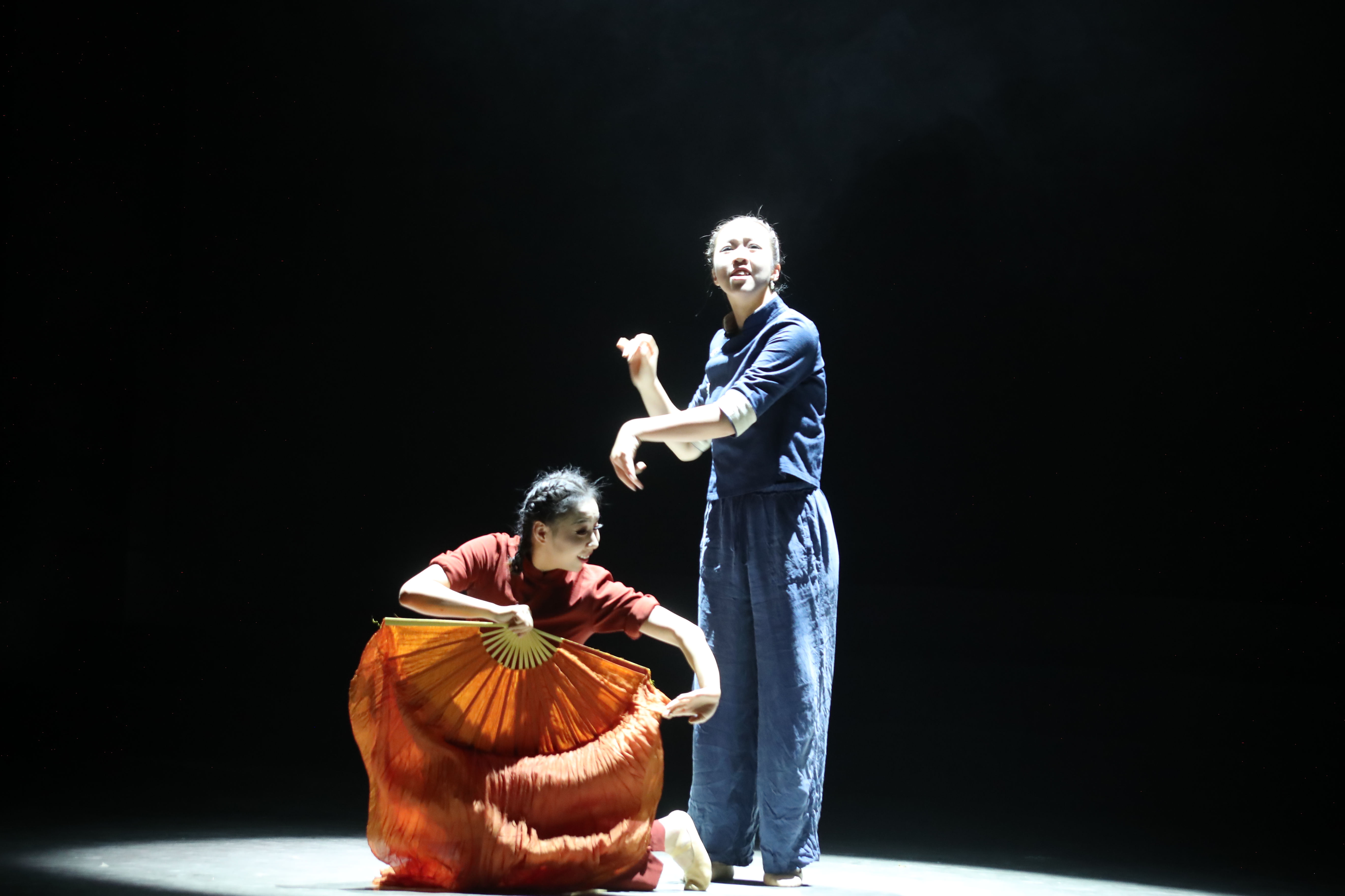 二等奖作品《恋土难移》,由新疆艺术学院2024级研究生孙冬雪创编,与2023级本科编导班闫新瑶一同表演。编导以黄河流域金沙泥砖雕的一对传承人母女为蓝本,展开艺术想象,并提取山东胶州秧歌动律与现代编创手法相结合。舞者手中的土黄扇似割不断的血脉奔涌,又如养育一方人的黄河奔腾,紧紧牵绕着一代又一代的非遗代表性传承人。光影流转间,两位舞者以极具张力的肢体对话,重现窑火旁的言传身教。这不仅是对传承人“择一业,终一生”匠人风骨的赞颂,更彰显出黄河作为华夏文明的摇篮,以亘古不息的母爱之姿,滋养着两岸艺人的生命与技艺。