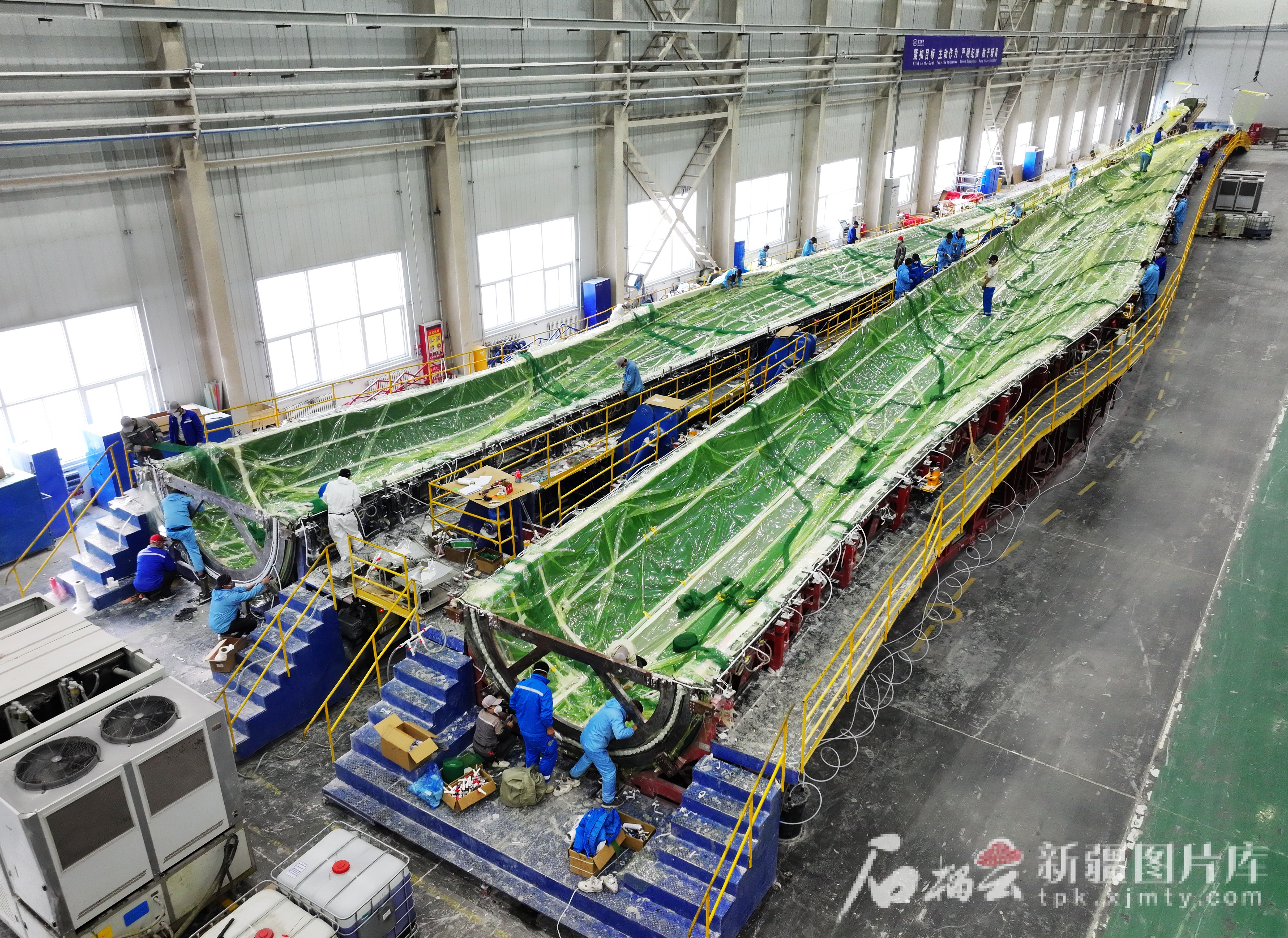 4月11日,在位于木垒哈萨克自治县的新疆东方风电新能源有限公司生产车间,工作人员在加紧生产风机叶片。何龙摄