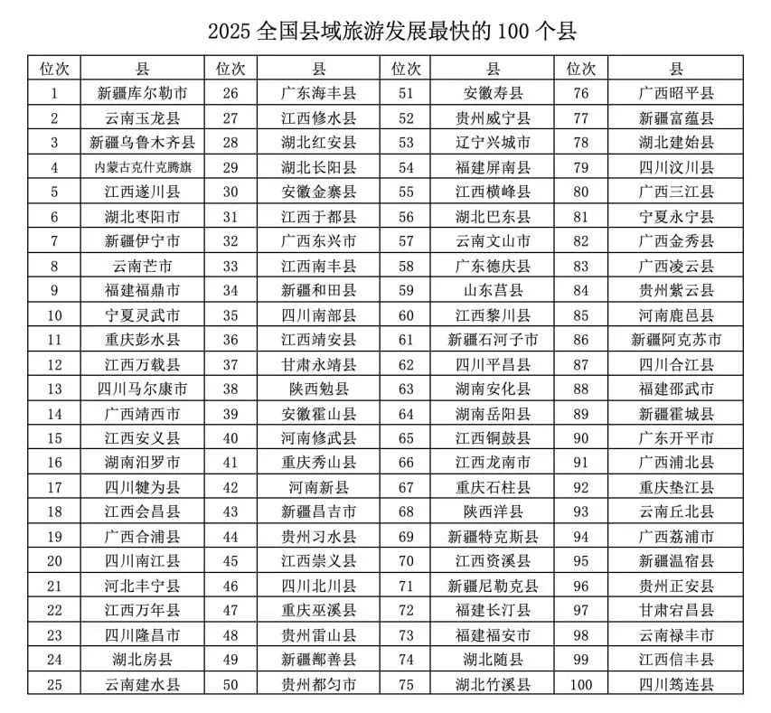 新疆跻身2025全国县域旅游发展最快百强县榜单的县域为:库尔勒市(第1位)、乌鲁木齐县(第3位)、伊宁市(第7位)、和田县(第34位)、昌吉市(第43位)、鄯善县(第49位)、石河子市(第61位)、特克斯县(第69位)、尼勒克县(第71位)、富蕴县(第77位)、阿克苏市(第86位)、霍城县(第89位)、温宿县(第95位)。