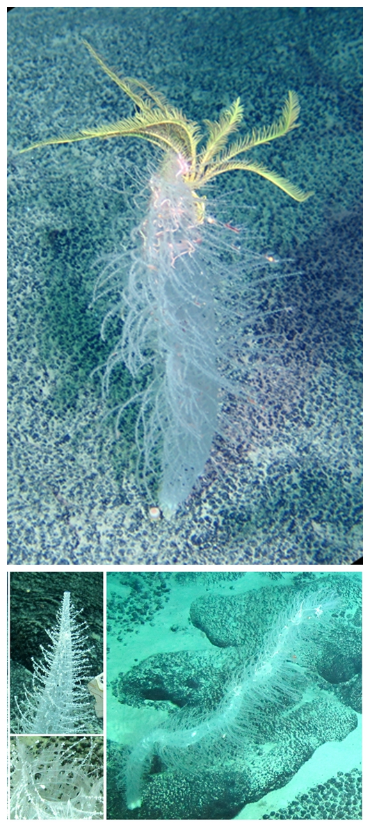 在西太平洋海山,我国科学家发现了一种新的“偕老同穴海绵”。在管状的“爱情公寓”外侧,伸出许多细长的“树枝”。这些“树枝”就像一个个海底停靠站,让海百合、蛇尾、虾等小生物附着生活。看起来,整株海绵就像一位在海底掌管生命繁荣的女神。科学家用希腊丰收女神的名字将这一新种海绵命名为“德墨忒尔海绵”,也称为“女神海绵”。