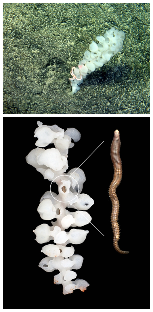 潜伏在绢网海绵体内的矶沙蚕。(新华社发)