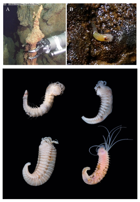 深海热液区是“生命的绿洲”,聚集了大量独特的深海生命。但一墙之隔的非活动热液区,则满目沧桑,看上去毫无生气。是否真的没有生命?在已死去烟囱体(喷发活动完全停止)表面的微小裂缝里,科研人员意外发现这里聚集着一类独特的管栖多毛类,它们可能以死亡烟囱体上残留的有机颗粒为食。尽管其形态特征与当前最近的亲戚极为相似,但基因测序的结果显示,两者的祖先已经分化了相当长的历史。结合头部领器官特征,科研人员将其命名为“领多栉虫”。在随后的研究中,还进一步在死亡烟囱体上发现了两个帽贝新种。