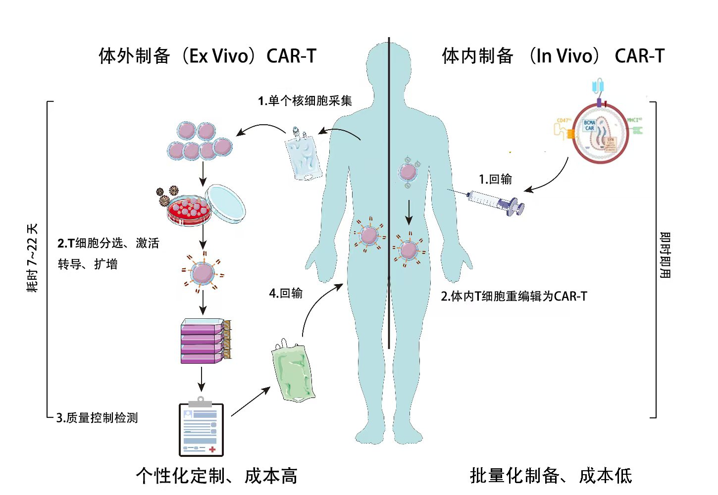 这是新疗法中体内制备car-t与传统体外制备car-t疗法相比较的示意图。(受访者供图)