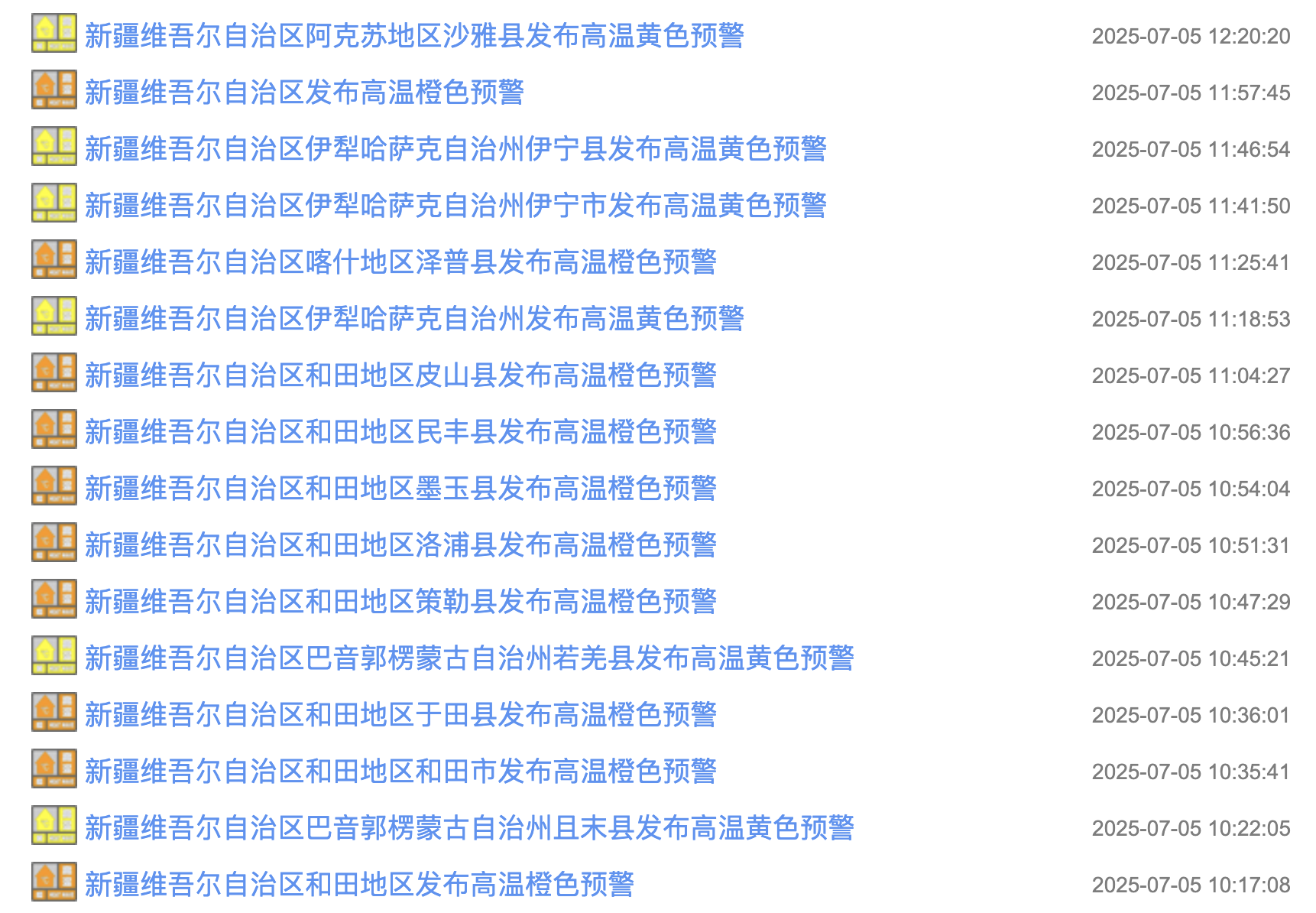 a a. a-据中国天气网预警信息,7月5日11时57分,新疆气象台将高温黄色预警升级为橙色。