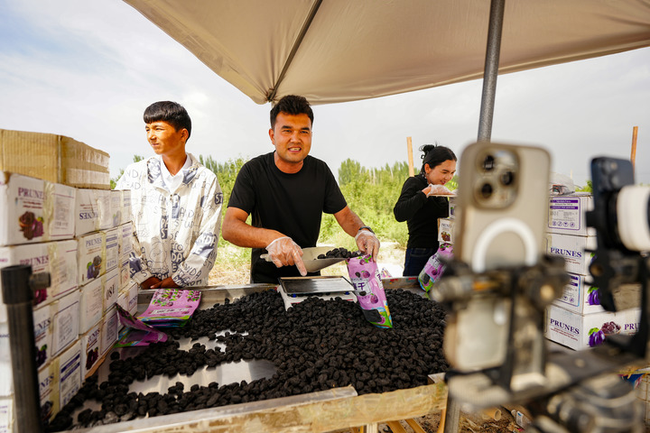 2025年6月23日,在新疆阿克苏市新疆红旗坡农贸物流园,“95后”电商米尔扎提·卡米力在直播带货当地农产品。新华社记者 徐宏岩 摄