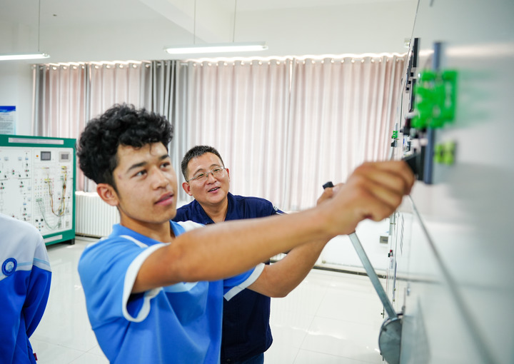 2025年6月27日,在新疆和田技师学院,北京援疆教师李东军(右)指导学生操作高压变配电设备。新华社记者 徐宏岩 摄