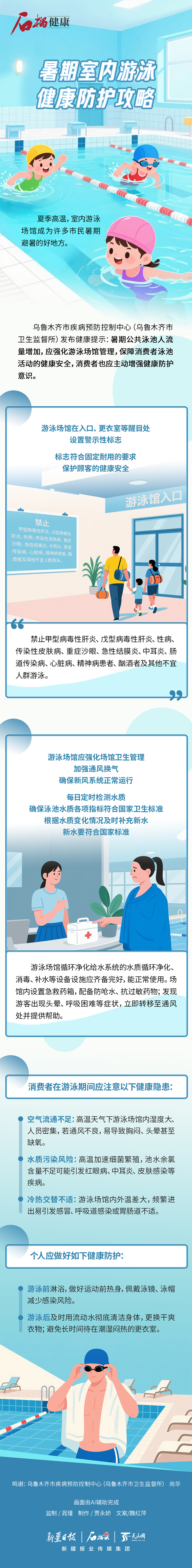 夏季高温,室内游泳场馆成为许多市民暑期避暑的好地方。乌鲁木齐市疾病预防控制中心(乌鲁木齐市卫生监督所)发布健康提示:暑期公共泳池人流量增加,应强化游泳场馆管理,保障消费者泳池活动的健康安全,消费者也应主动增强健康防护意识。