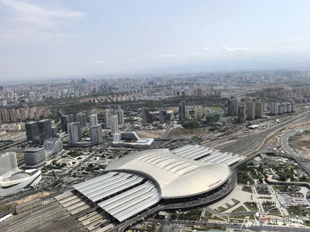 新疆第一高楼毗邻乌鲁木齐高铁站,站在楼顶俯瞰乌鲁木齐高铁站如同展翅雄鹰。石榴云/新疆日报记者 于江艳摄