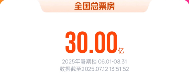 a a. a-据网络平台数据,截至7月12日13时51分,2025年暑期档(6月-8月)总票房(含预售)突破30亿元!
