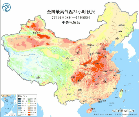 7月14日8时至21日8时全国最高气温预报。图/中央气象台