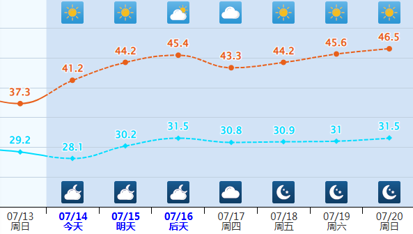 a a. a-7月14日,新疆气象台发布高温黄色预警信号,未来一周左右,全疆大部区域将出现高温天气,局地可达45℃以上。