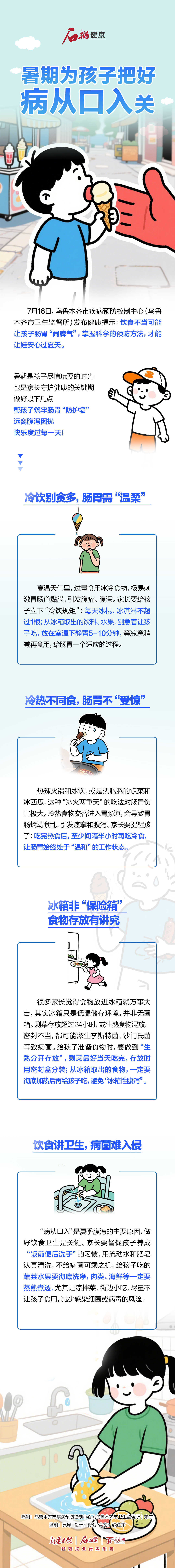 7月16日,乌鲁木齐市疾病预防控制中心(乌鲁木齐市卫生监督所)发布健康提示:饮食不当可能让孩子肠胃“闹脾气”,掌握科学的预防方法,才能让娃安心过夏天。