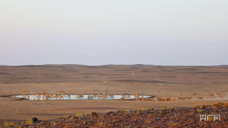 卡拉麦里保护区的普氏野马和野驴在畅饮 (央广网发 马晓杉 摄)