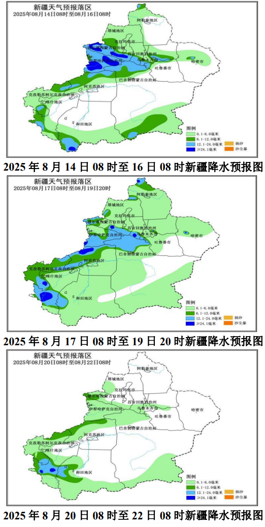 a a. a-石榴云/新疆日报讯(记者 谢慧变报道)8月12日,记者从新疆气象台获悉:8月14日至22日,全疆将先后经历三轮明显降水过程,其中伊犁哈萨克自治州、博尔塔拉蒙古自治州、天山山区、喀什地区、克孜勒苏柯尔克孜自治州等地山区局部区域可能出现暴雨,上述区域局地发生短时强降水、雷暴大风、冰雹等强对流天气的可能性较大。新疆气象台提示,需防范局地暴雨、强降水引发的山洪和泥石流、滑坡等地质灾害,以及对旅游、农牧业、交通出行等的不利影响。