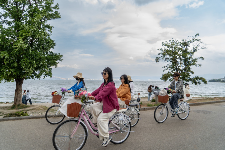 游客在云南大理洱海生态廊道骑行(2025年4月23日摄)。新华社记者 刘莲芬 摄