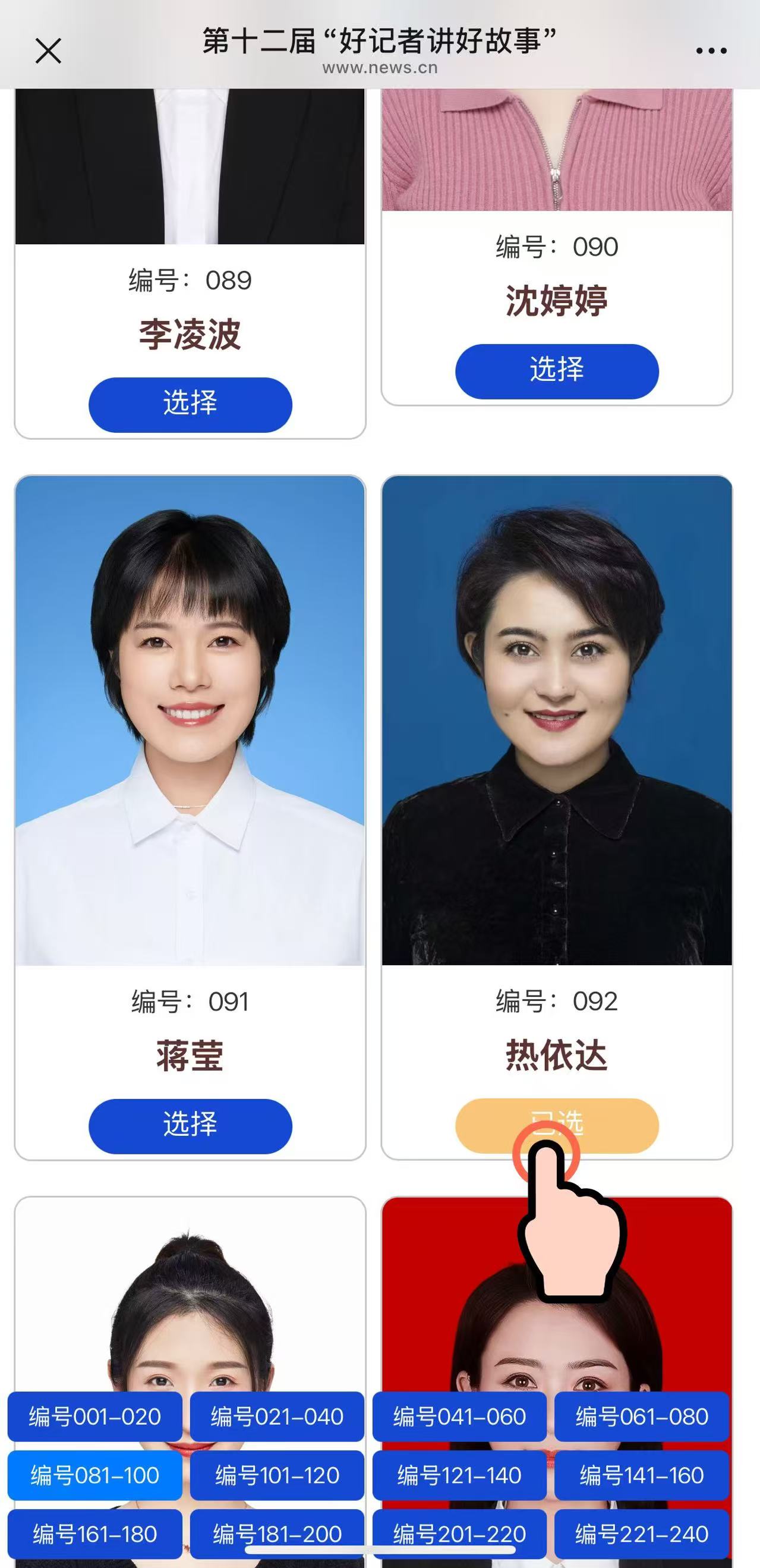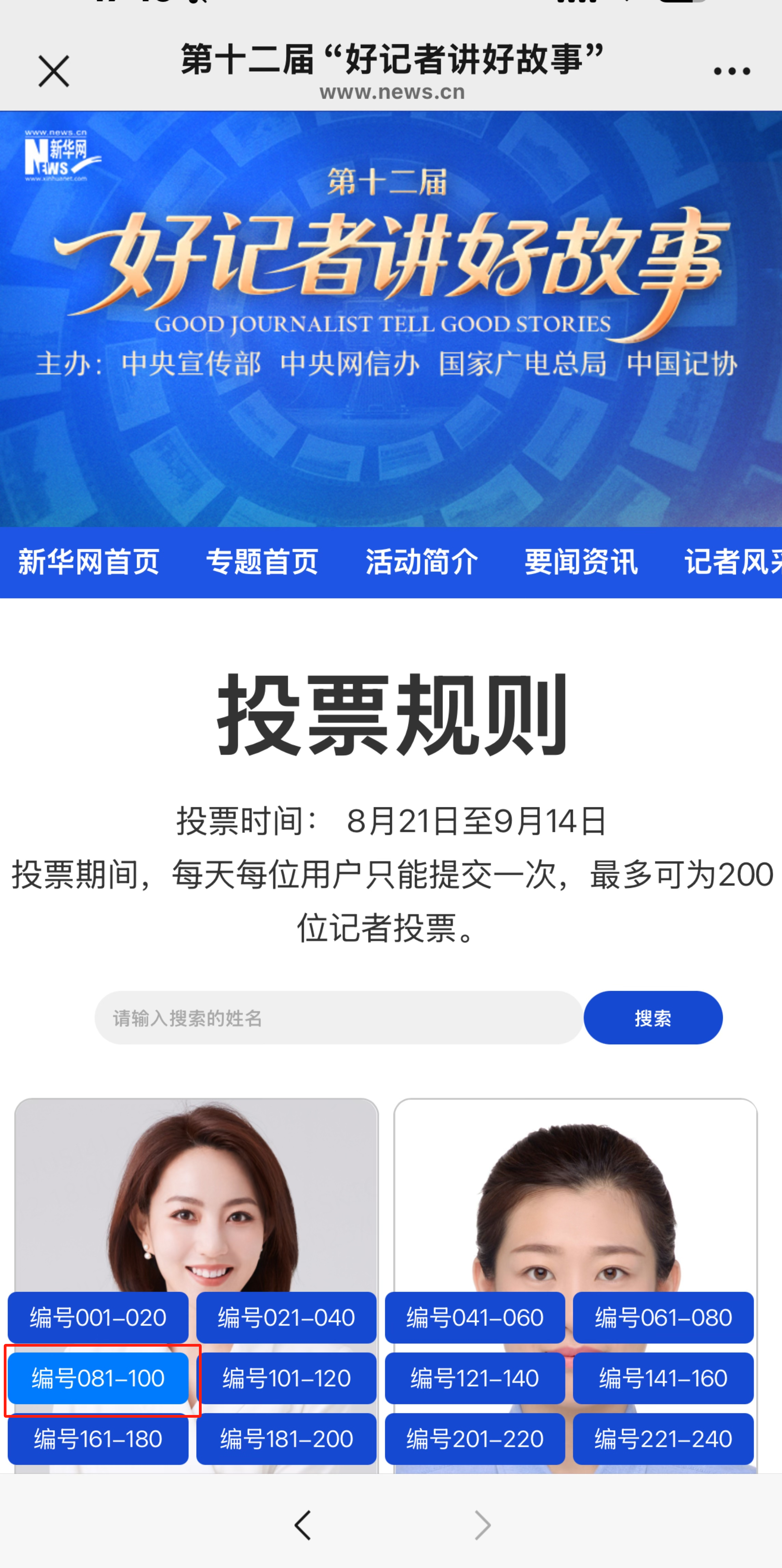 a a. a-石榴云/新疆日报讯(记者 闫蕊报道)8月21日10时,全国第十二届“好记者讲好故事”活动投票正式启动。经过层层选拔,我区共有5名记者代表新疆参加全国第十二届“好记者讲好故事”选拔赛,分别是:热依达(92号)、方文静(94号)、李典(96号)、帕丽旦·买买提力(100号)、雷那特·别克强塔伊夫(110号)。