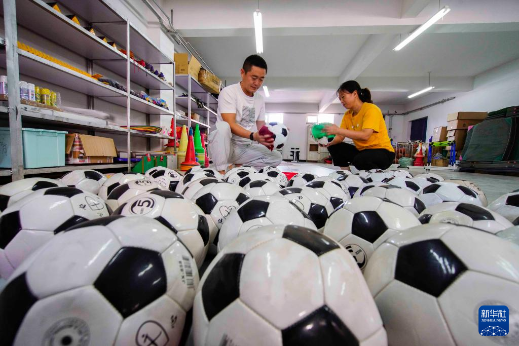 8月25日,河北省遵化市第二中学体育教师在擦拭整理足球。新华社发(刘满仓摄)