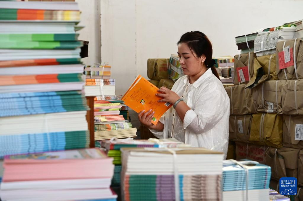 8月25日,工作人员在河北新乐市新华书店仓库整理清点中小学教材,准备送往各学校。新华社发(贾敏杰摄)