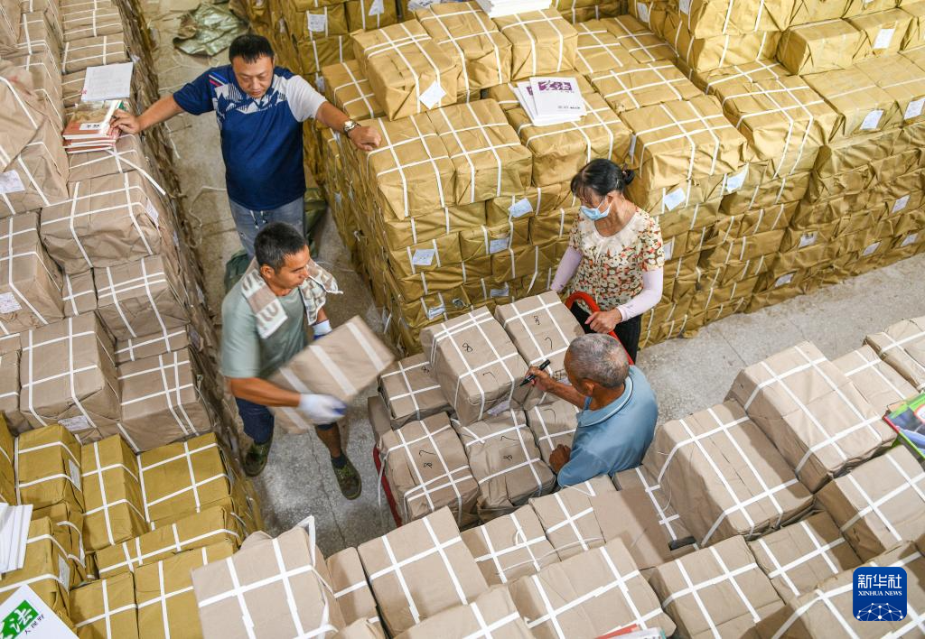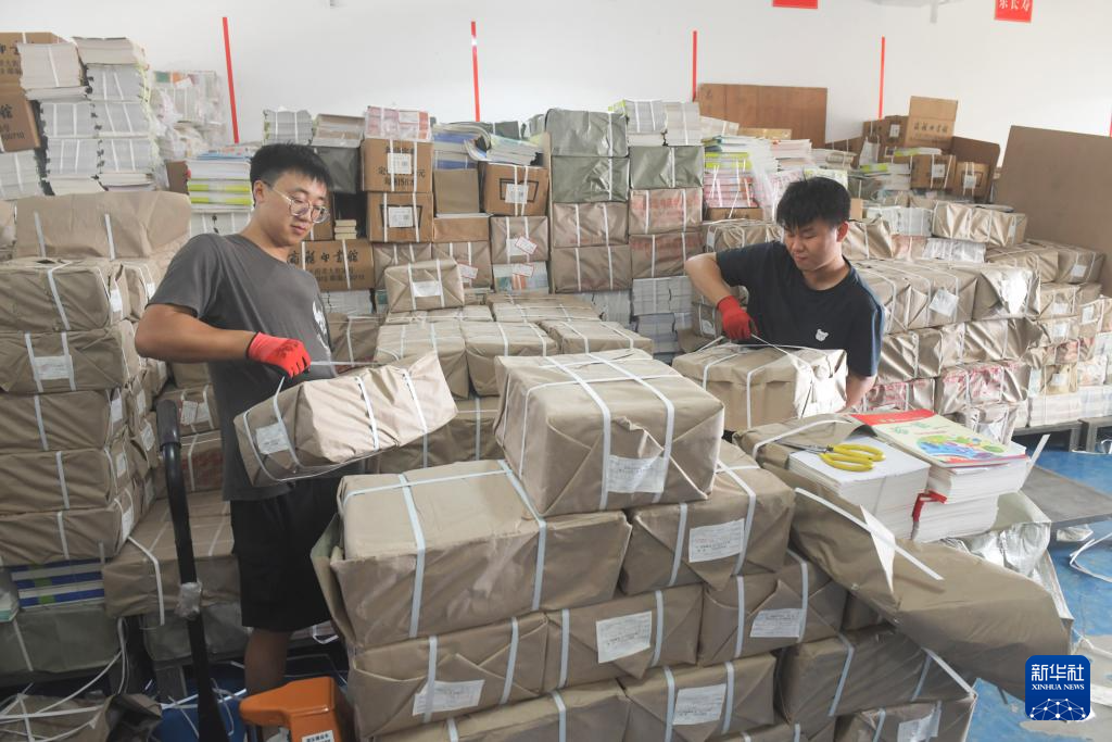 8月25日,在河南省沁阳市新华书店教材仓库,工作人员在配发新学期教材。新华社发(杨帆摄)