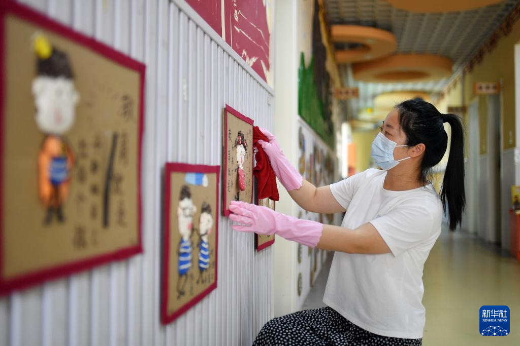 8月25日,山东省青岛市崂山区金家岭街道中心幼儿园员工在擦拭走廊画框。新华社发(王海滨摄)