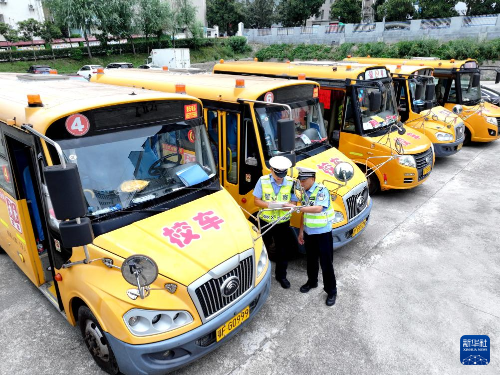 8月25日,湖北省襄阳市保康县公安局交警大队民警对校车进行安全检查(无人机照片)。新华社发(杨韬摄)