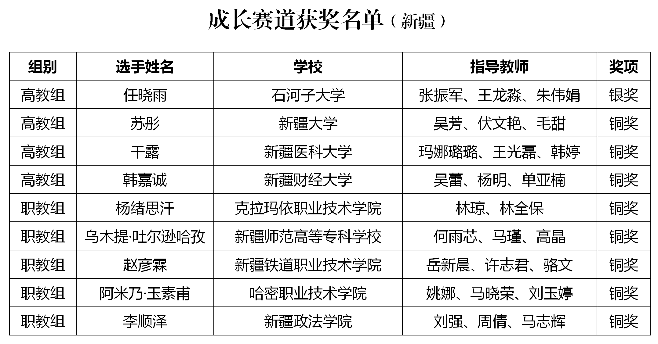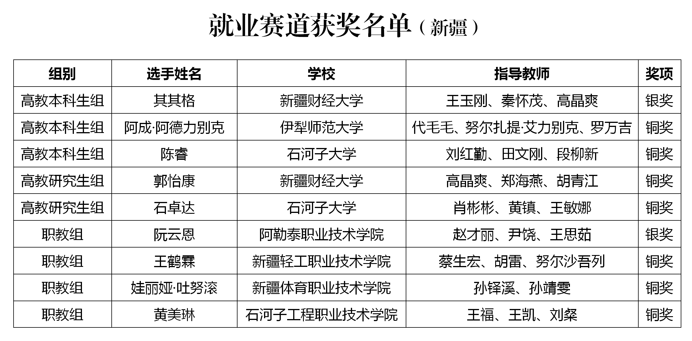 名单显示,在第二届全国大学生职业规划大赛全国总决赛成长赛道中,新疆共有1人获得银奖、8人获得铜奖;在就业赛道中,有2人获得银奖、7人获得铜奖。