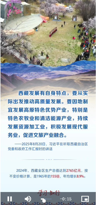 2025年8月20日,习近平总书记率中央代表团乘专机抵达拉萨,出席西藏自治区成立60周年庆祝活动。在听取西藏自治区党委和政府工作汇报时,习近平总书记强调,“持续深入抓好稳定、发展、生态、强边四件大事,努力建设团结富裕文明和谐美丽的社会主义现代化新西藏”。