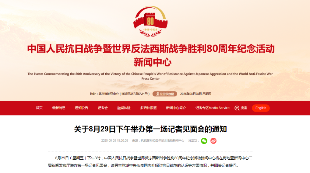 8月29日(星期五)下午3时,中国人民抗日战争暨世界反法西斯战争胜利80周年纪念活动新闻中心将在梅地亚新闻中心二层新闻发布厅举办第一场记者见面会,请民主党派中央负责同志介绍对抗日战争的认识等方面情况,并回答记者提问。(记者 范思翔)