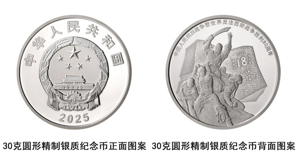 30克圆形银质纪念币背面图案由“大刀进行曲”雕塑、“九·一八”历史博物馆“残历碑”雕塑等元素构成,并刊“中国人民抗日战争暨世界反法西斯战争胜利80周年”字样及面额“10元”字样。最大发行量20000枚。