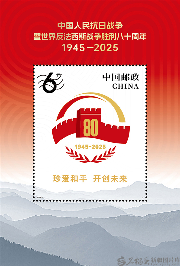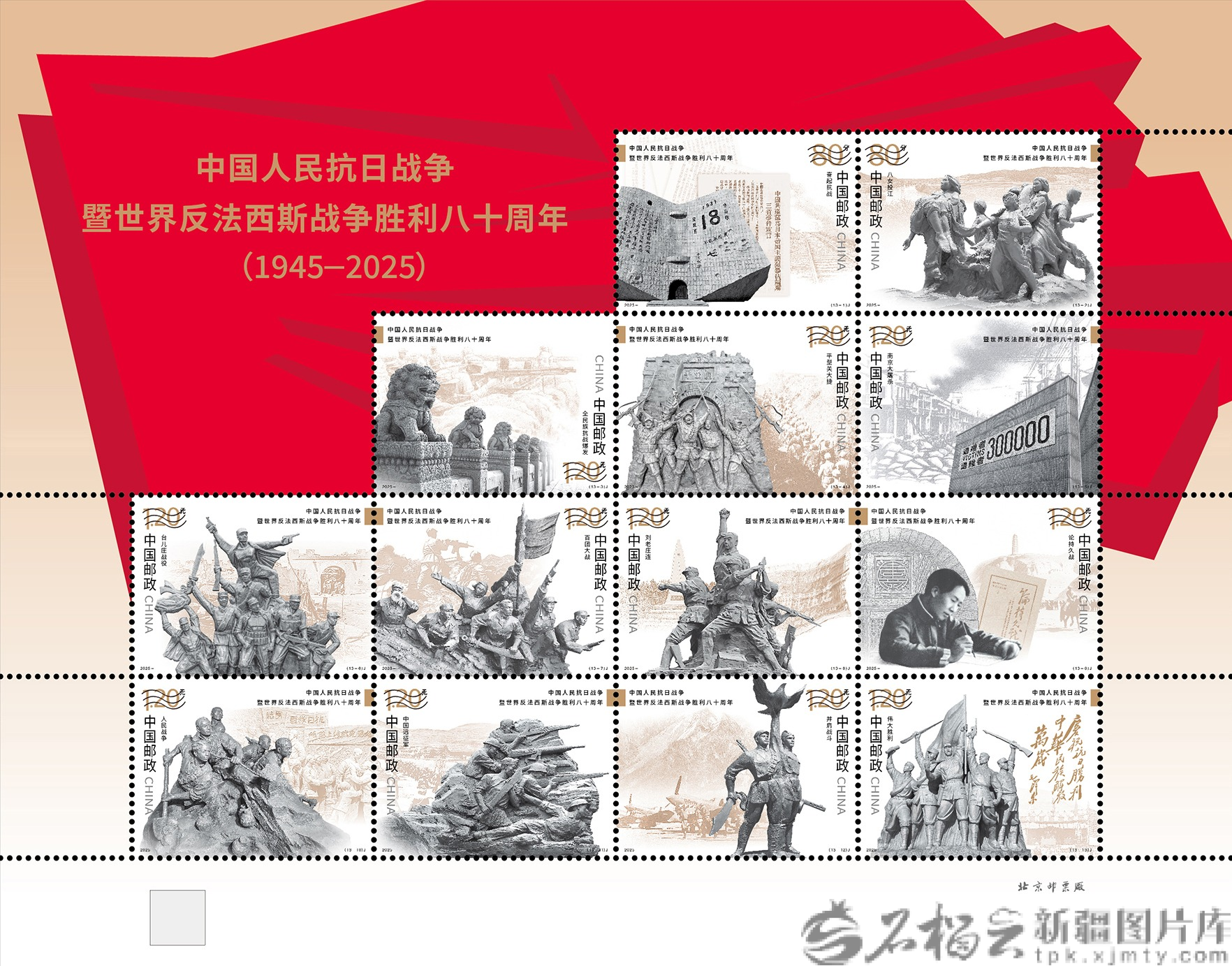 《中国人民抗日战争暨世界反法西斯战争胜利八十周年》纪念邮票小型张。图/中国邮政集团有限公司乌鲁木齐市分公司提供