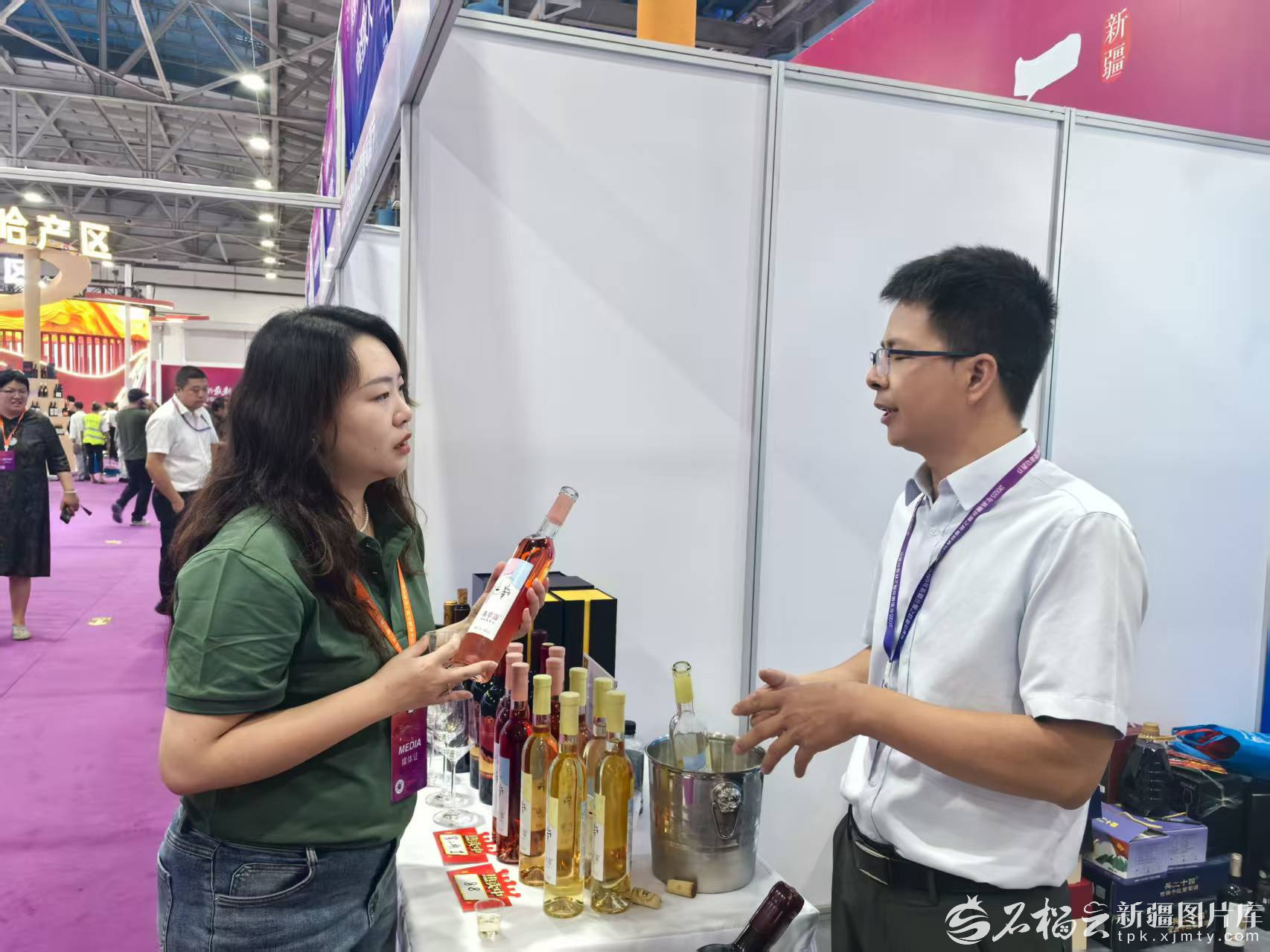 8月30日,2025新疆丝绸之路葡萄酒节展会上葡萄酒厂家与经销商交流。石榴云/新疆日报记者 赵悦摄