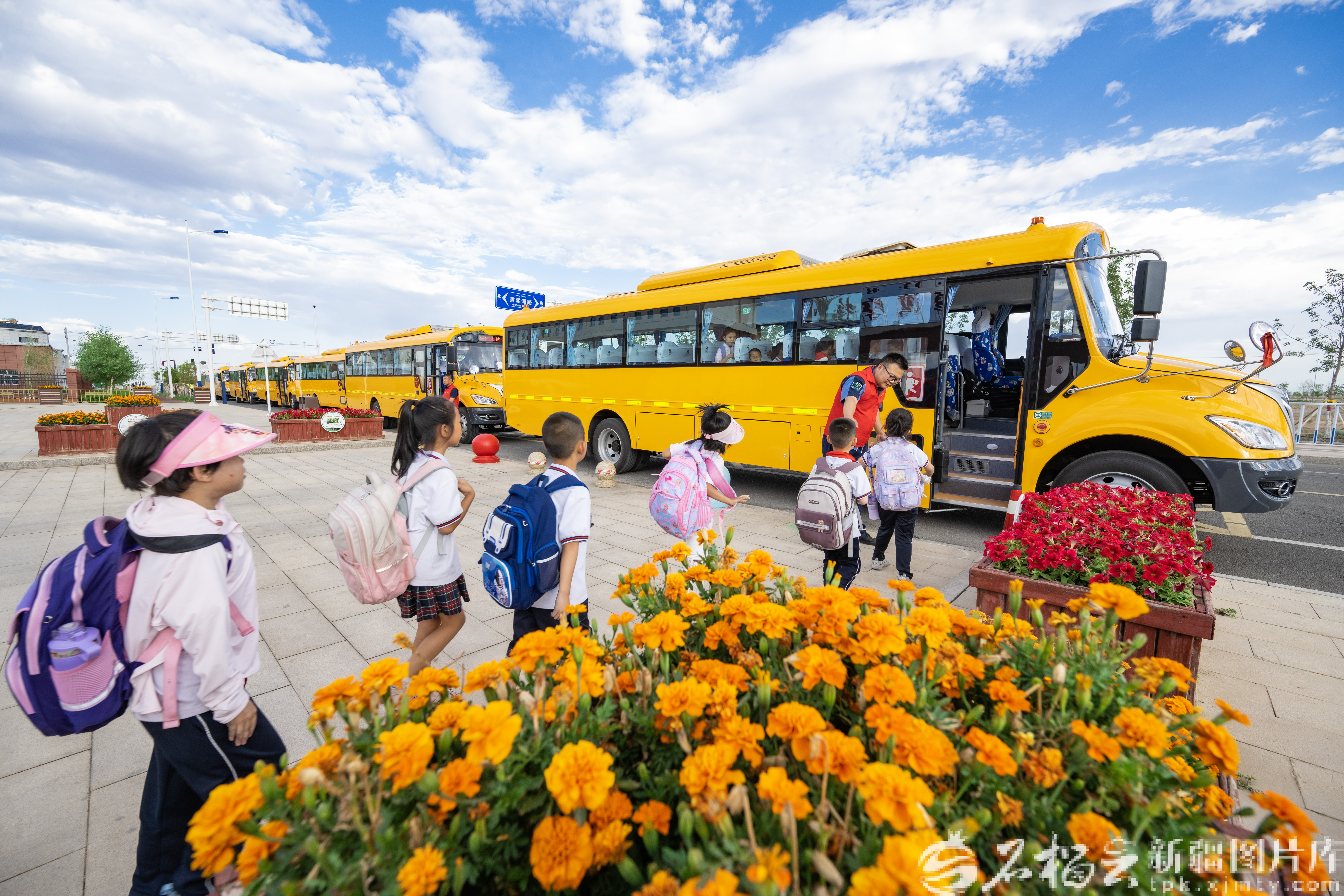 6月27日,准东经济技术开发区九年一贯制学校 ,一年级的同学们乘坐校车回家。何龙摄
