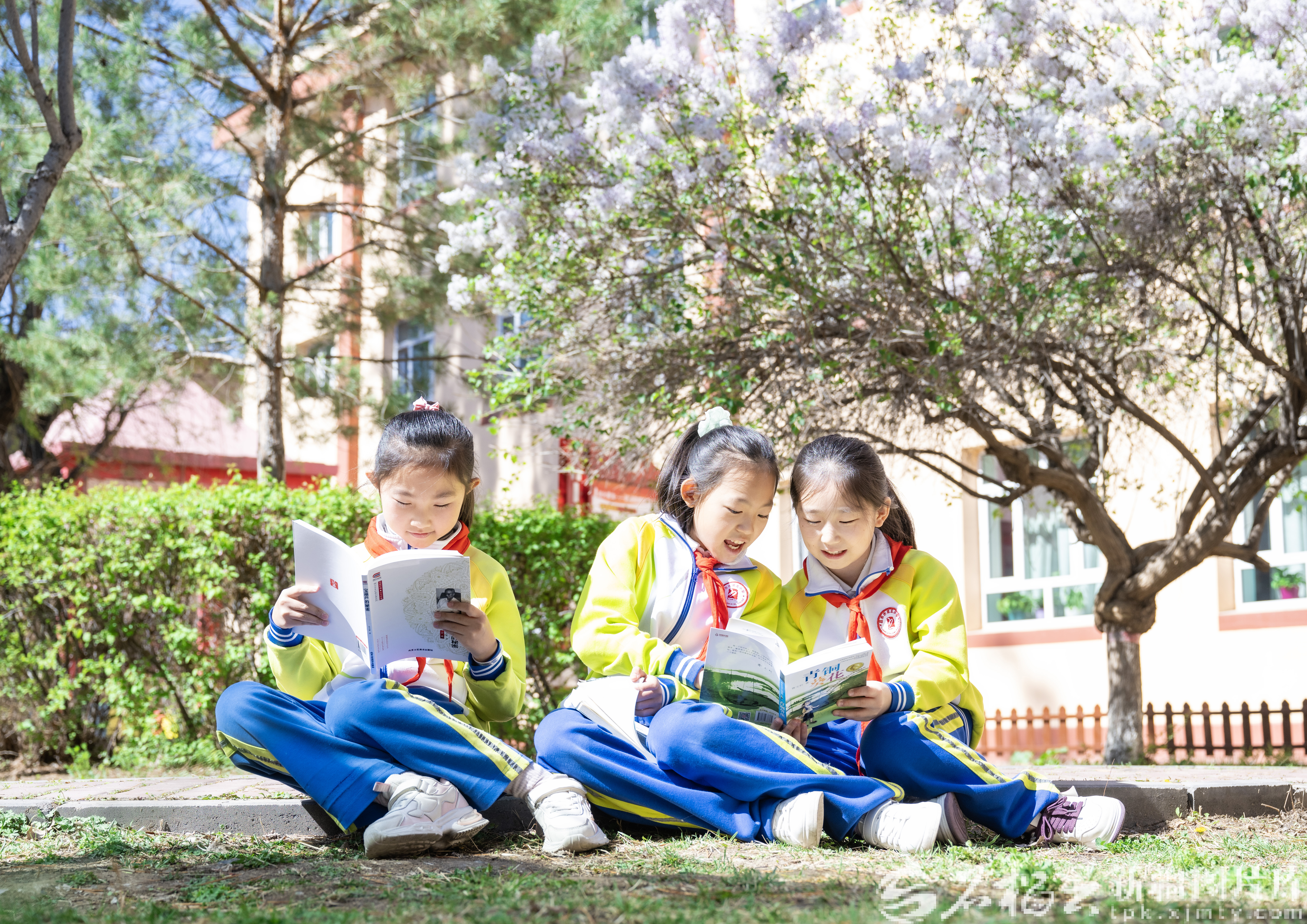 4月21日,昌吉市第五小学,同学们在校园内读书。何龙摄