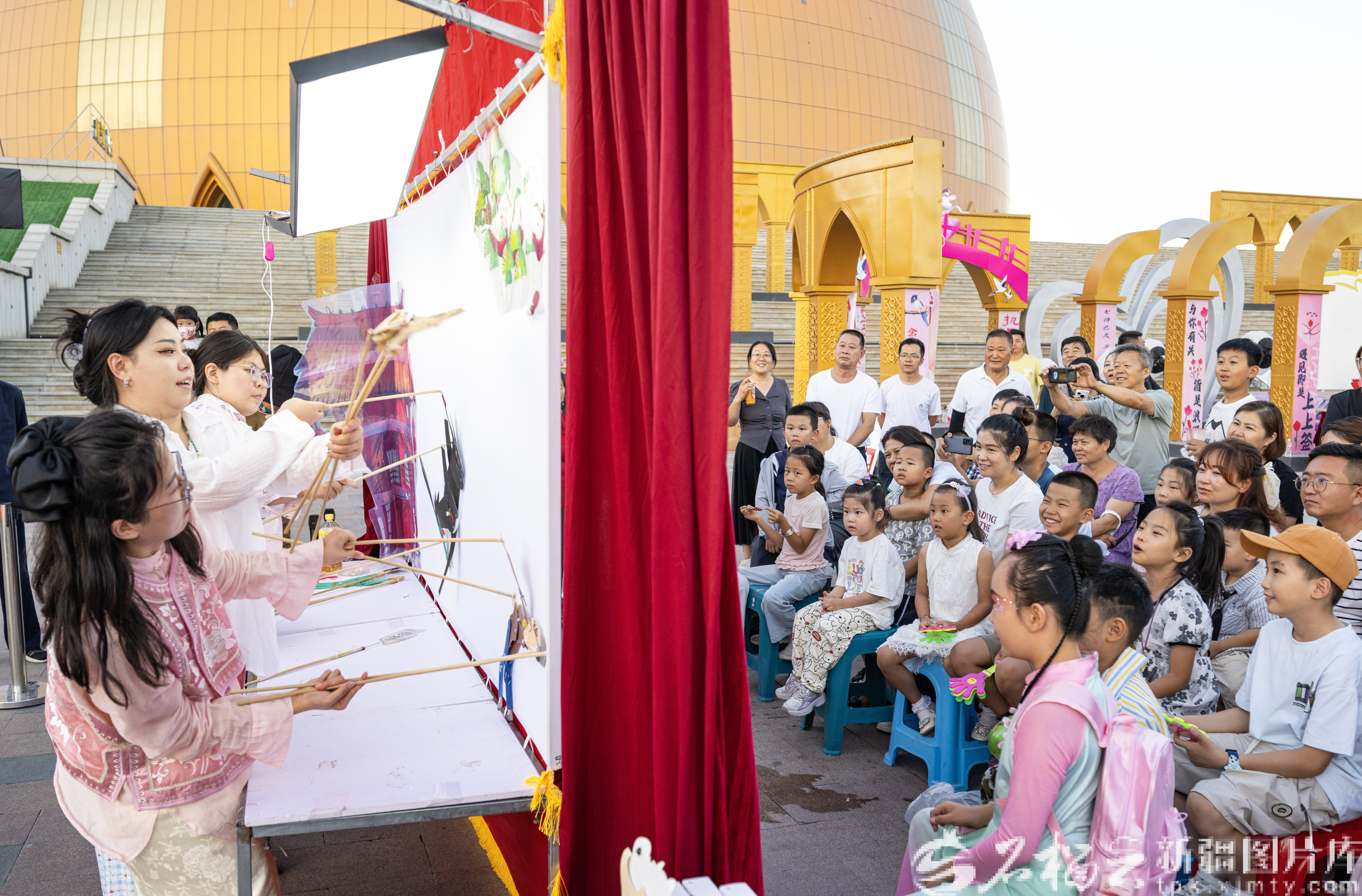 8月29日,新疆大剧院广场,市民在观看皮影戏演出。何龙摄