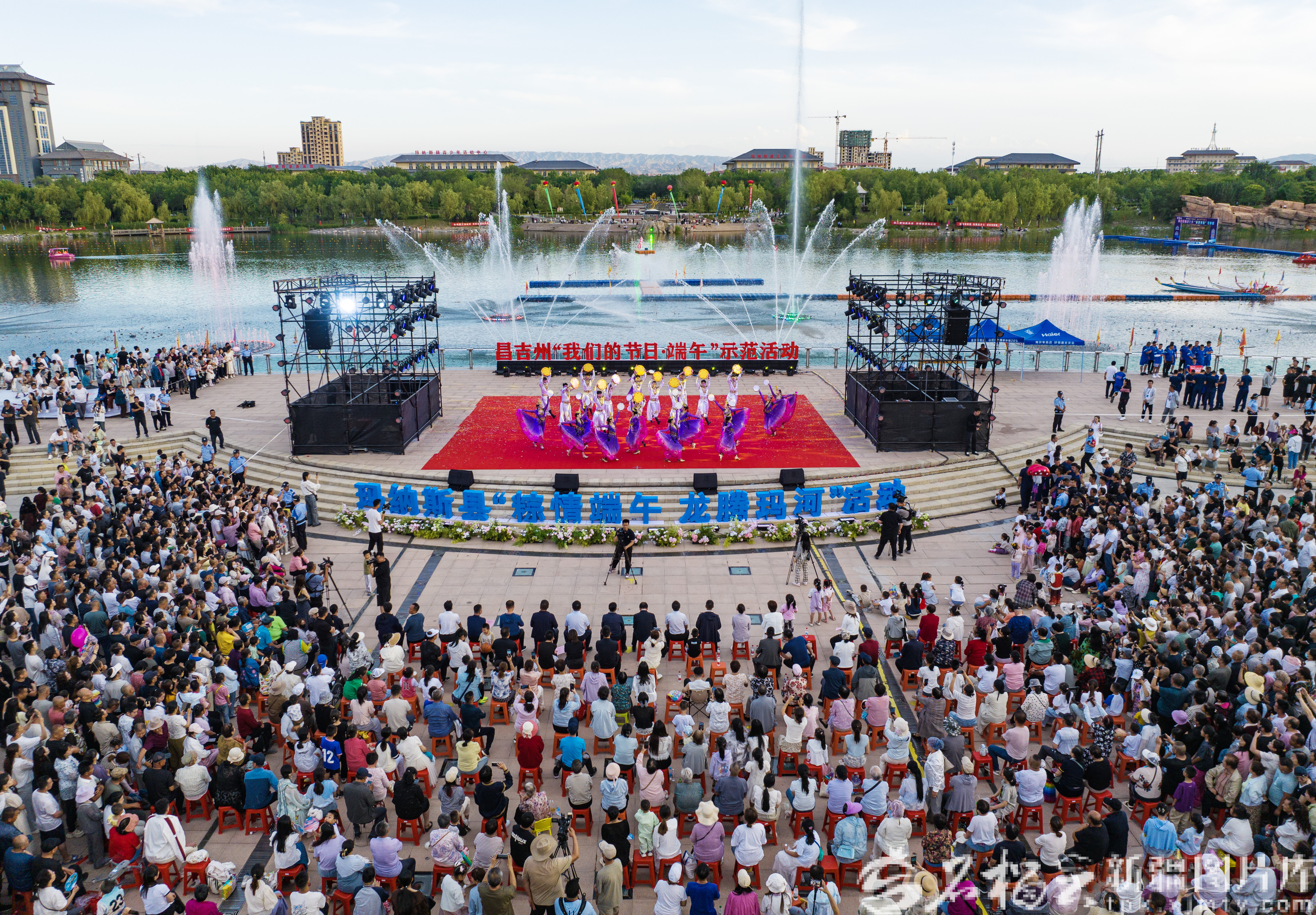5月31日,昌吉州“我们的节日·端午”示范活动《粽香端午·龙腾玛河》歌舞晚会在玛纳斯县葡萄酒公园举行。图为晚会现场。何龙摄