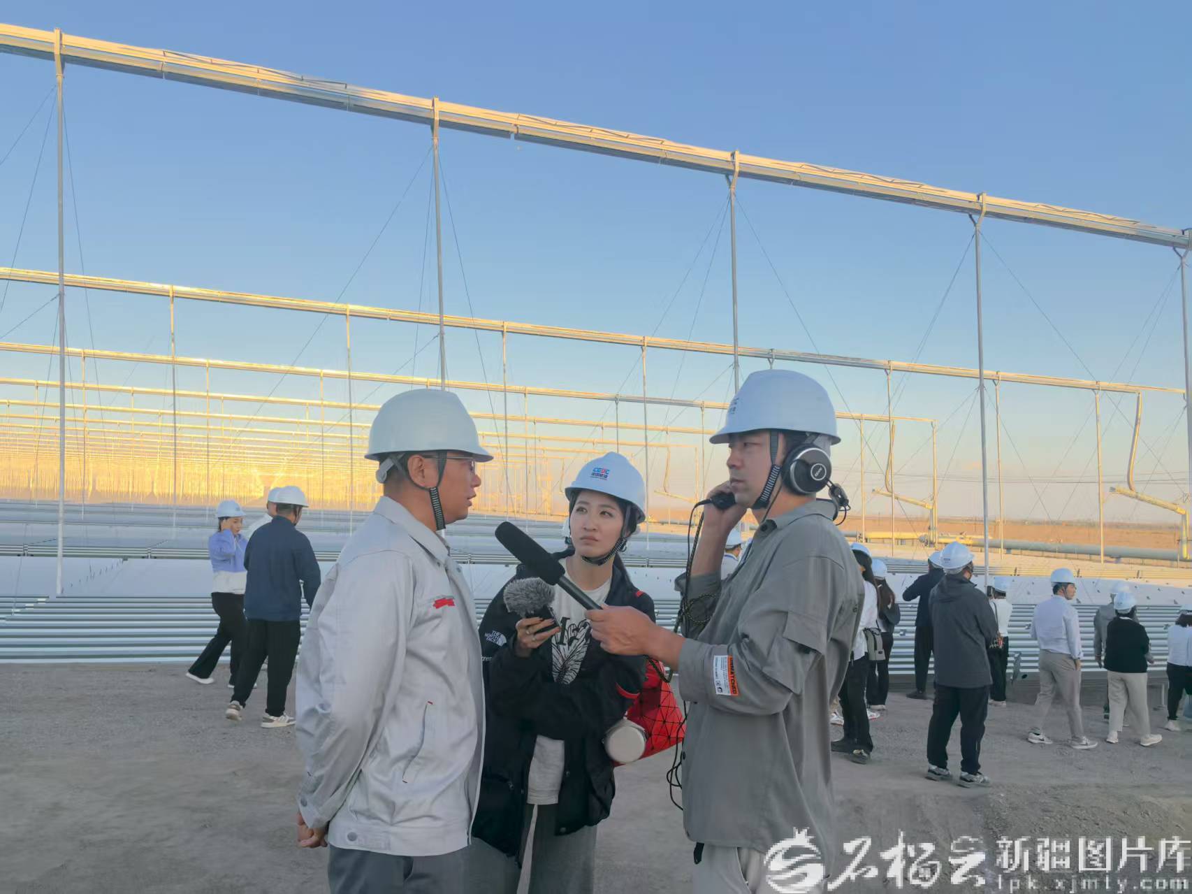 9月12日,记者们采访三峡能源哈密百万千瓦“光热 光伏”一体化综合能源示范项目基地负责人。石榴云/新疆日报记者 赵悦摄。