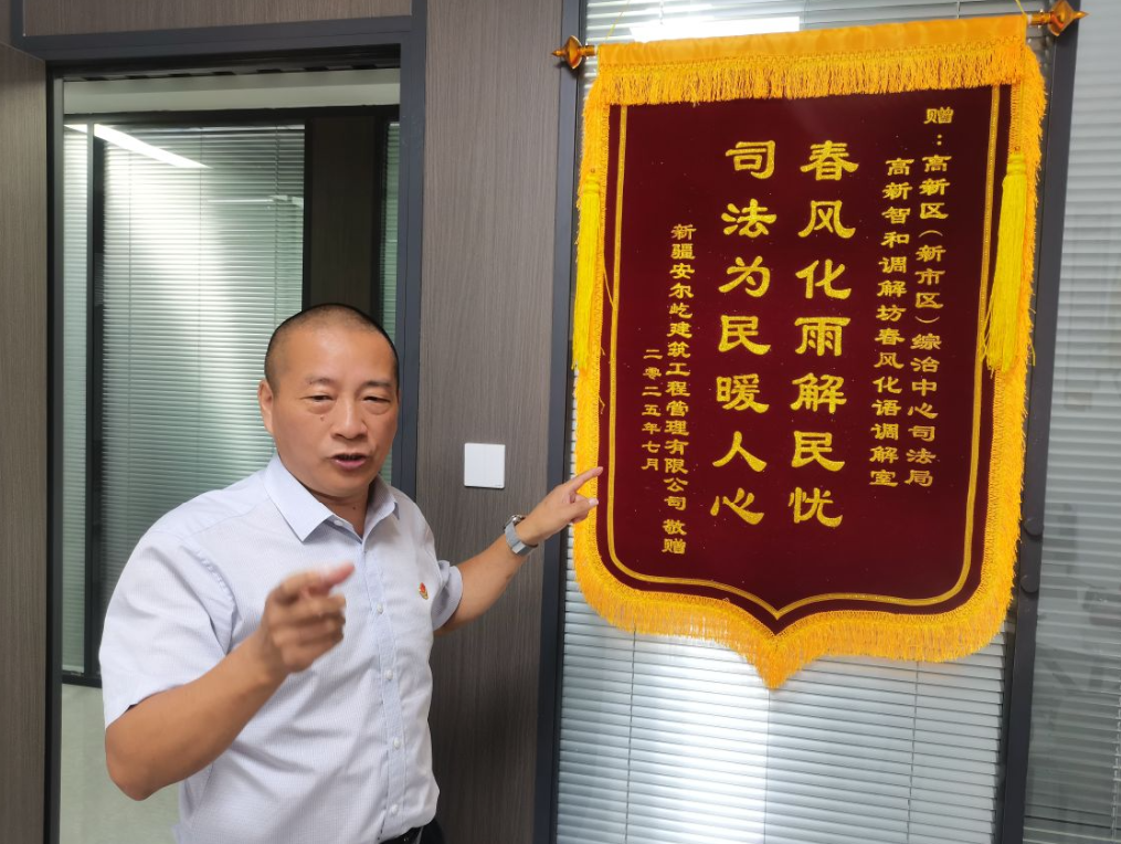 8月19日,高新区(新市区)综治中心调解员沈卫忠向记者讲解锦旗背后的故事。石榴云/新疆法治报记者 杨蕊摄
