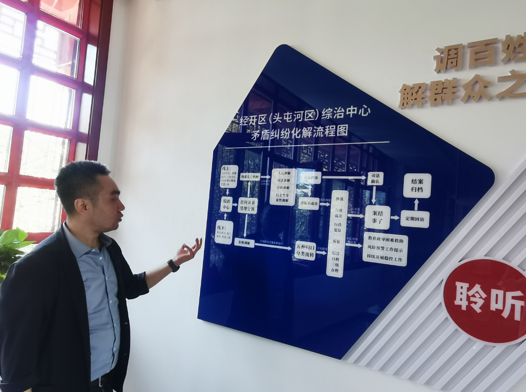 8月22日,经济技术开发区(头屯河区)综治中心工作人员杨任巍鹏向记者介绍矛盾纠纷化解流程。石榴云/新疆法治报记者 杨蕊摄
