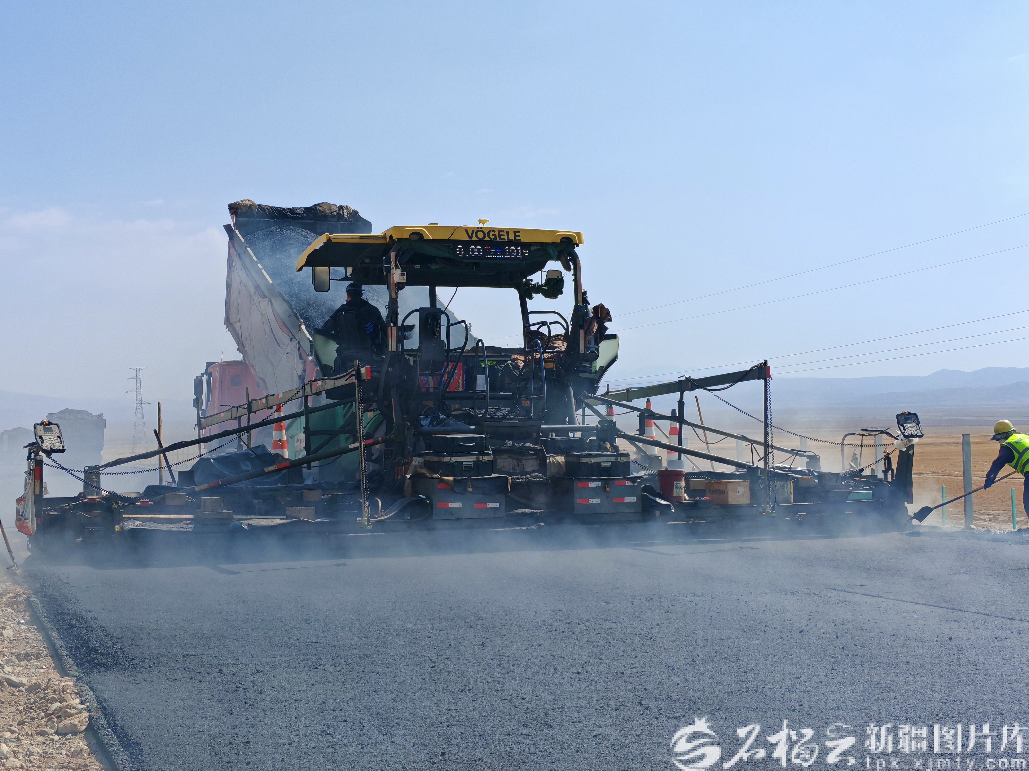 9月13日,那巴公路项目在加紧摊铺沥青。石榴云/新疆日报记者 逯风暴摄